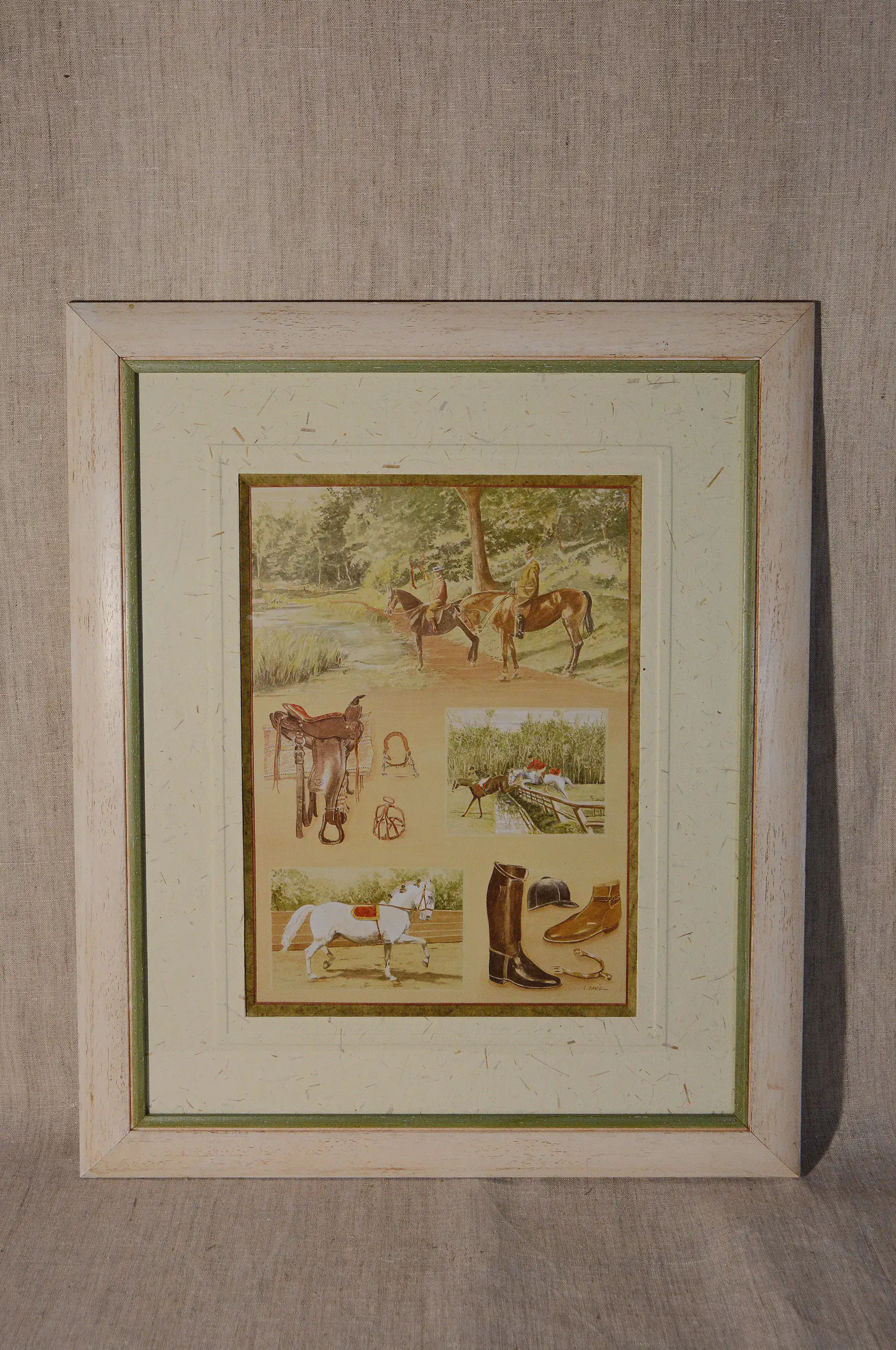 Reproduction d’aquarelle sur papier, scènes et harnachements du cavalier et de son cheval.